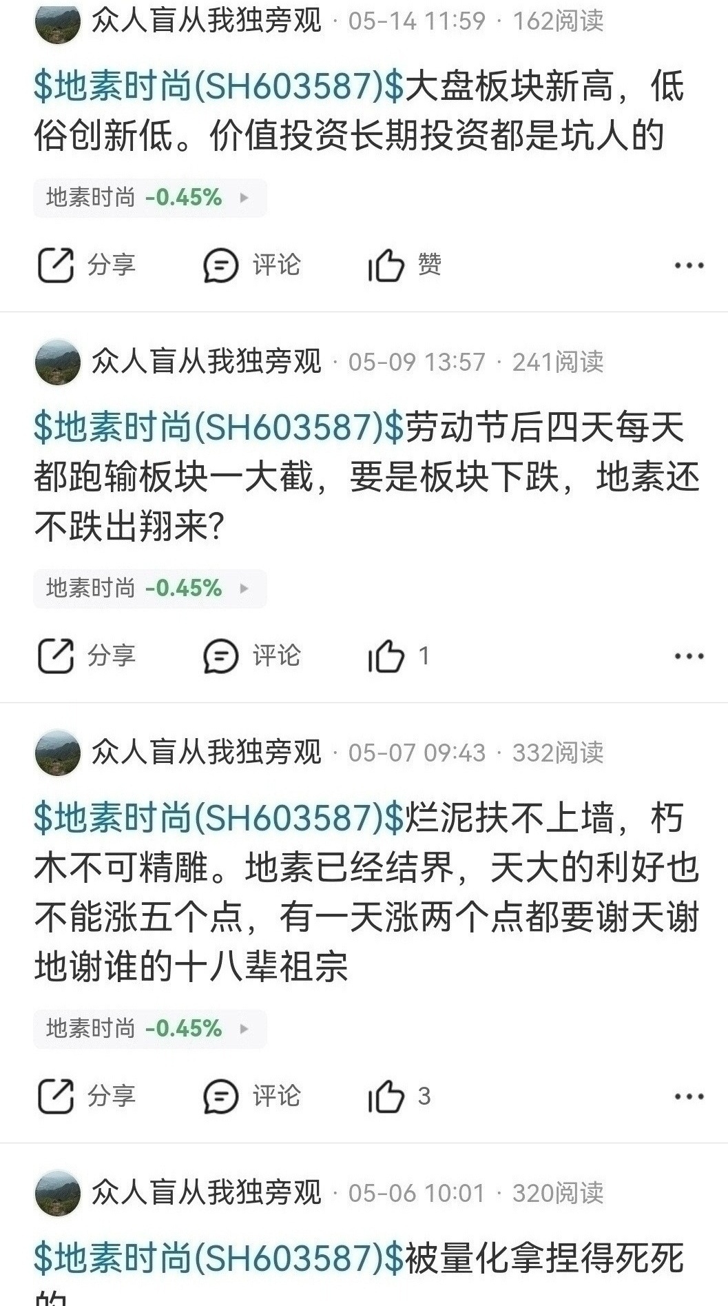 $深港通服装纺织R(SZ483041)$ $地素时尚(SH603587)$ 北向资金去年九月十元左右清仓卖出踏空,今年六月加入沪港通才能买,已经踏空了,季线底部中长线至少十倍涨幅,周线上涨趋势今年翻倍,底部唱空攻击人的都是同一批账号,这种行为破坏投资环境坚决抵制打击
