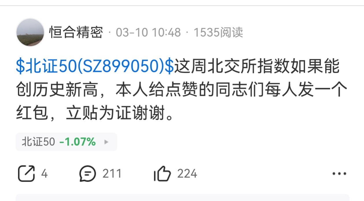 以前说过北交所创历史新高给点赞的同志们每人发一个红包看了一下总共224个赞每人十