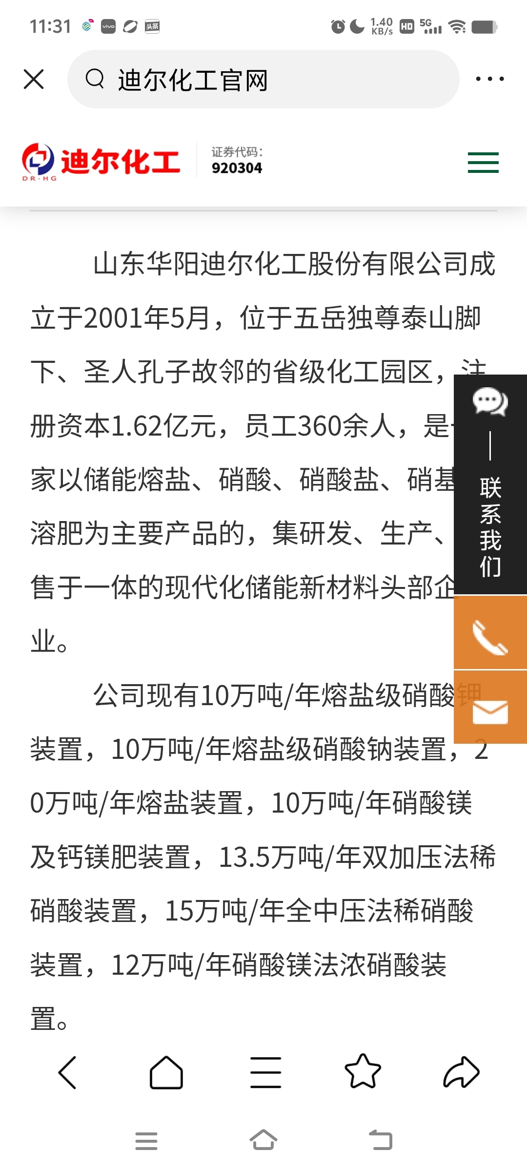 $北证50(SZ899050)$ 北证熔盐储能化工头部企业迪尔化工随子公司甘肃迪尔20万吨熔盐储能项目投产正式迈入年产百万吨行列。公司集军工炸药+熔盐储能+农药化肥+医药原料+烟花爆竹…全产业链生产,已收购的润禾钾盐及新成立的子公司甘肃迪尔更值得期待。