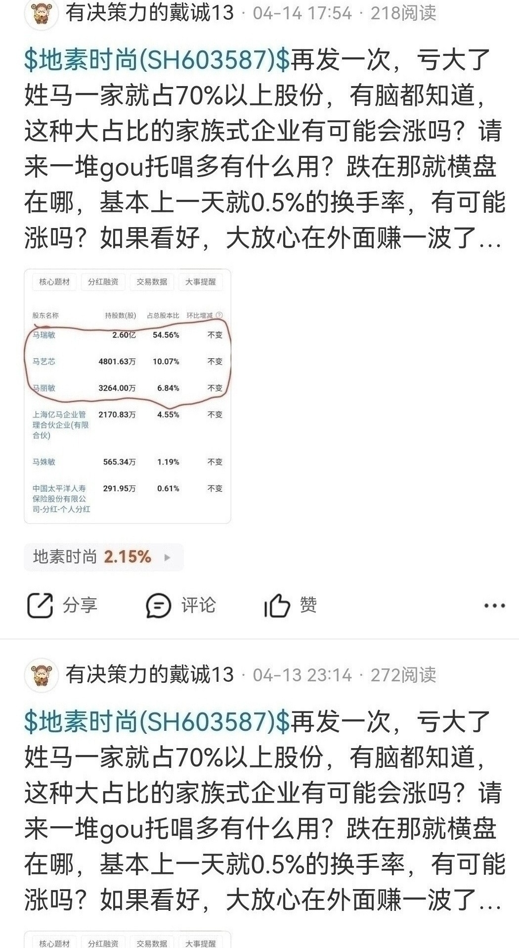 $深港通服装纺织(SZ983041)$ $地素时尚(SH603587)$ 首发经济谷子经济龙头,补涨空间可观,周线第五浪主升启动,服装板块年涨幅百分之三十三,地素年涨幅百分之零,补涨空间至少百分之三十以上,季线底部中长线至少十倍涨幅,季线底部十元附近卖出踏空后唱空攻击人没有意义,北向入场最后买入机会,年稳定盈利3亿以上,现金资产30多亿,至少百亿市值才合理